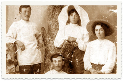 9. פתח תקווה, 1908. מימין: שרה כבשנה, ומרים (כבשנה) יופה, משה לייב. יושב: יצחק כבשנה.