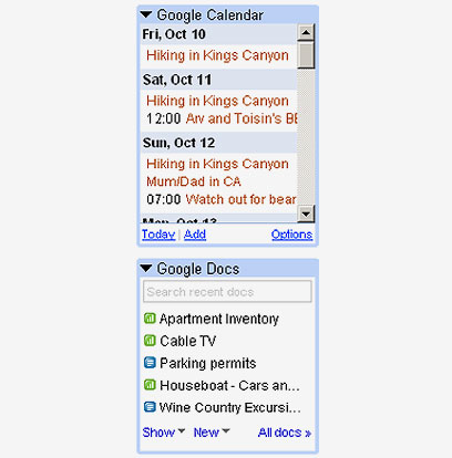 בעמודה הצידית של Gmail, בה מוצגת בדרך-כלל רשימת החברים לצ'יטוט והתוויות, אפשר להציג גם ווידג'טים (או כפי שגוגל ומיקרוסופט מכנות אותן, גאדג'טים - אנחנו קוראים להם יישומונים). יש להפעיל אותם על-ידי לחיצה על הבקבוק הירוק, לעבור לכפתור ההגדרות שלידו (Settings) והקלדה או הדבקה של כתובת הווידג'ט אותו רוצים להוסיף - למשל, גאדג'ט של YouTube. שני ווידג'טים חדשים שאפשר לשלב בדף ה-Gmail האישי, מתפריט הבקבוק הירוק, יציגו ארועים שעדכנתם ב-Google Calendar ומסמכים שנשמרו ב-Google Docs.