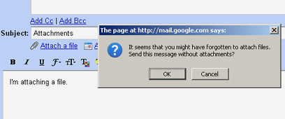 אחת התכונות החדשות היא Forgotten Attachment Detector, גלאי קבצים מצורפים שנשכחו. אם מפעילים את התכונה, היא תתריע כשתנסו לשלוח מייל שאמור לכלול קובץ מצורף מבלי שצירפתם בפירוש את הקובץ. Gmail מזהה מיילים כאלו לפי מספר המילים. שימוש במילה attached בתוכן המייל שכתבתם, למשל, יקפיץ את חלון ההתראה שיזכיר לצרף את הקובץ הנשכח.