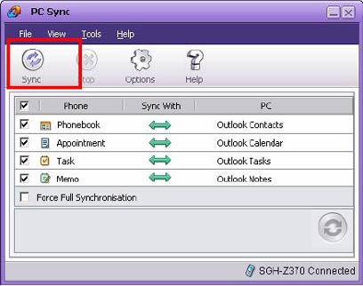 במסך החדש שייפתח נוכל לבחור את הפריטים אותם אנו רוצים לסנכרן כדוגמת: אנשי קשר, יומן וכו'. לאחר לחיצה על מקש Synchronize הסנכרון יתחיל להתבצע. באם קיימת התנגשות התוכנה תפתח חלון חדש ותאפשר לך לבחור מה לעשות במקרה של התנגשות נתונים בין המכשיר למחשב. סימון התיבה התחתונה תאפשר חזרה על בחירה זו במקרה של הודעות התנגשות רבות.