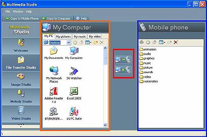במסך הפתיחה של תוכנת הסנכרון יש צורך לבחור Multimedia Studio. לאחר מכן ייפתח חלון נוסף שבו יש תפריט חדש יש לבחור את האפשרות הראשונה File Transfer Studio. אז ייפתח לנו ממשק העברת הקבצין בין המכשיר למחשב ולהפך כמו בתמונה הבאה :
