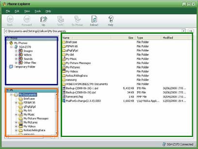 במסך הראשי של תוכנת הסנכרון של סמסונג, יש לבחור בכפתור Phone Explorer. במסך חדש ייפתח מסך ניהול הקבצים. בחלקו השמאלי התחתון ניתן לראות את התיקיות שבמחשב, ובחלקו השמאלי העליון ניתן לראות את התיקיות במכשיר הסלולרי. במסך הימני ניתן לראות את הקבצים בתוך התיקייה המסומנת.