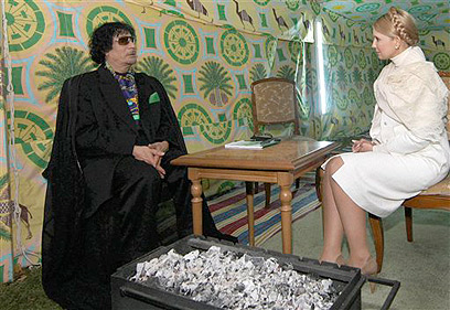 ראש ממשלת אוקריאנה, יוליה טימושנקו, ומועמר קדאפי (צילום: AP)
