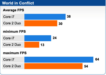 במבחן הביצועים של משחק האסטרטגיה World in Conflict, קצב הפריימים הממוצע היה 38 לעומת 30 בלבד (שיפור של 26%) וקצב הפריימים המקסימלי עמד על 64 לעומת 54 (18 אחוז שיפור). בקצב הפריימים המינימלי חל שיפור עצום: מ-13 ל-24 – כמעט כפול, והבדל מאוד משמעותי כשמדובר בפריימים לשנייה, שאחראים על תמונה חלקה ונעימה לעין בסצינות מהירות.