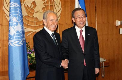מזכ"ל האו"ם באן והנשיא פרס במטה האו"ם (צילום: AP)
