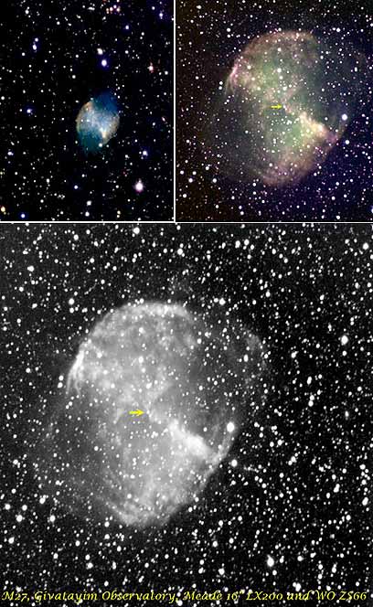 בשלוש תמונות אלה, של ערפילית המשקולת, שצולמו במצפה הכוכבים בגבעתיים, אפשר לראות בבירור את מעטפת הכוכב מתפשטת בחלל. שתי התמונות צולמו במהלך ערב קהל שהתקיים במצפה והקהל חזה בתהליך הצילום. הערפילית צולמה בשלושה מסננים שונים; שני מסננים מעבירים אור הנפלט מאטומי חמצן ומימן המצויים בערפילית וכן במסנן כחול, בכל מסנן היה משך הצילום כ-15 דקות, ס"ה 45 דקות צילום. ייחודה של תמונה זו שהיא צולמה בטלסקופ שקוטרו 66 מ"מ בלבד (William-Optics ZS 66) שאליו הוצמדה מצלמת CCD אסטרונומית.