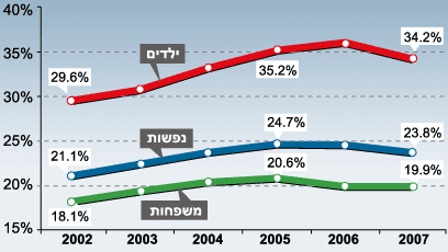עוד עולה מהנתונים, כי אחוז העניים ירד מ-24.5 אחוזים ב-2006 ל-23.8 אחוזים בשנה שעברה. אחוז הילדים שחיו במשפחות עניות רשם גם הוא ירידה - בניגוד לשנים קודמות - ועתה הוא עומד על 34.2 אחוזים - לעומת 35.8 אחוזים בשנת 2006. עם זאת, אחוז הקשישים העניים עלה מ-21.5 אחוזים ב-2006 ל-22.6 אחוזים בשנה שעברה. המצב חמור מאוד בקרב המשפחות הערביות - שם 51.5 אחוזים מהמשפחות הן עניות, ירידה קלה לעומת שנת 2006 - אז הנתון היה 54 אחוזים.