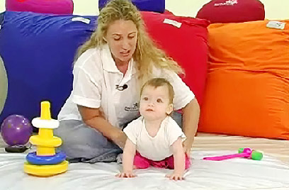 א. זחילה על 6: התינוק מושיט יד לפנים (לחפץ), מעביר משקל קדימה, משהו קורה לו ביחס בין פלג הגוף העליון (הידיים והחזה), לבין פלג הגוף התחתון (הרגליים והאגן). נוצרת תגובה ברגליים ולאט מתחילה להתהוות תנועה לפנים.