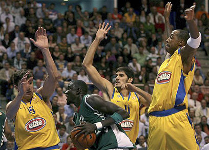 נ'דונג מוקף צהובים. מספק סולידיות מתחת לסל (צילום: AP)