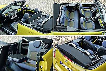 גג הבד של המיני מאפשר קיפול בתוך 15 שניות, גם בזמן נסיעה איטית - עד 30 קמ"ש. בנוסף, ניתן לפתוח אותו באופן חלקי, כמעין גג שמש, במהירות של עד 120 קמ"ש. כדי להגן על הנוסעים, מאחורי צמד המושבים האחוריים ישנה קשת התהפכות, שיוצאת אוטומטית אם חיישני הרכב מזהים סכנת התהפכות.