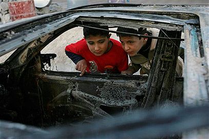 ילדים פלסטינים ליד מכונית שרופה בחברון (צילום: AP)