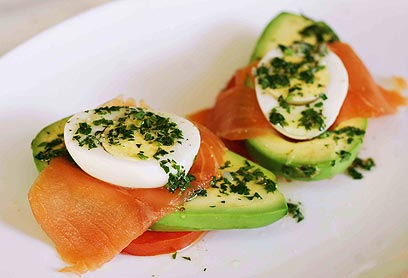 סלט אבוקדו, סלמון מעושן וביצה קשה