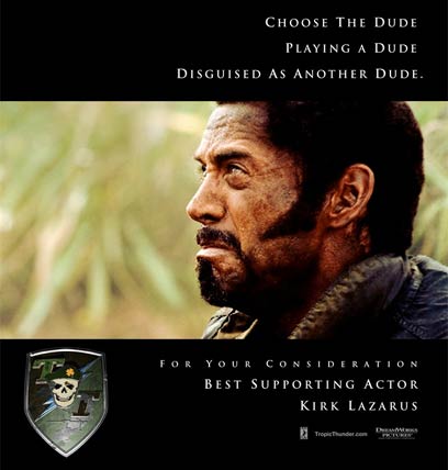 קירק לזארוס, למי שטרם הכיר, הוא הדמות ההיסטרית אותה מגלם רוברט דאוני ג'וניור ב"רעם טרופי" של בן סטילר. בסרט, קירק לזארוס הוא שחקן מוערך ומסור, שעל מנת לגלם את דמותו של איש צבא שחור עובר טיפול קוסמטי מקיף, שלא לדבר על אימוץ הסלנג השחור הסטריאוטיפי.