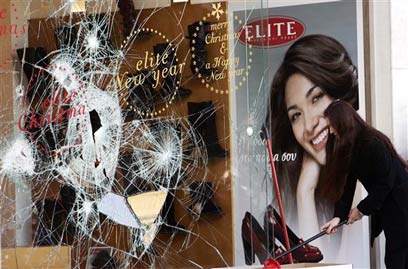השוטרים לא מנעו מהמתפרעים לנפץ חלונות ראווה (צילום: AP)