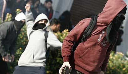 צעירים משליכים אבנים באתונה, היום בצהריים (צילום: AFP)