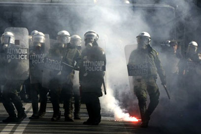 מוקדם יותר, התחדשו העימותים בין מפגינים לשוטרים ביוון ובסלוניקי - בשולי צעדות שנערכו היום במסגרת השביתה הכללית שעליה הוכרז לפני שבועות במחאה על מדיניותה הכלכלית של המדינה. באתונה צעדו יותר מעשרת אלפים מפגינים לעבר כיכר הפרלמנט בעיר, ובשולי המצעד נרשמו עימותים בין כמאה מקרב המפגינים לבין השוטרים. השוטרים ירו גז מדמיע לאחר שקבוצת צעירים יידו אבנים ובקבוקי תבערה לעברם בכיכר סינטגמה. גם בסלוניקי התנגשו מפגינים צעירים עם שוטרים בשולי הפגנה שבה השתתפו כ-2,000 בני אדם.
