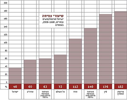 הדו"ח מציין שגם תמונת הצמיחה איננה שלמה. בחמש השנים האחרונות המשק אמנם צמח בשיעור שנתי של יותר מ-5 אחוזים, שהוא גבוה בהשוואה למערב. ואולם בסיכום כולל של העשור, הצמיחה הסתכמה רק ב-40 אחוז, בגלל המיתון הכבד עקב האינתיפאדה - שיעור נמוך בשליש מהמערב (כ-60 אחוז) וכמחצית עד פחות מרבע הצמיחה של הודו (112 אחוז) וסין (176 אחוז).