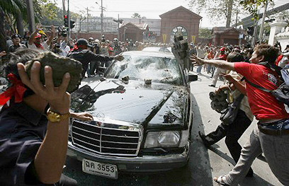 מפגינים בתאילנד רוגמים באבנים של חבר אופוזיציה (צילום: רויטרס)