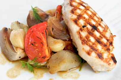 - מניחים את הירקות על הצלחת, מעל הירקות מניחים את חזה העוף המושחם ומטפטפים את הרוטב מעל העוף והירקות.