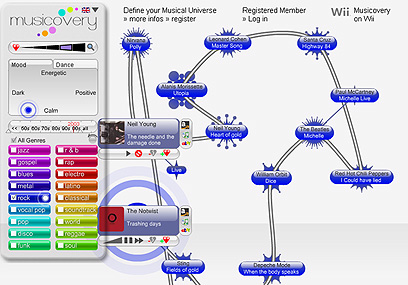 מכירים את פנדורה (שאינו זמין יותר לישראלים), שמתיימר לזהות את הטעם המוזיקלי שלכם לפי השירים האהובים? Musicovery מתאים לכם מוזיקה לפי מצב הרוח, שנע בין במרווח שבין ארבע אפשרויות: קודר, רגוע, אנרגטי וחיובי, וגם לפי עשור וז'אנר אהובים. התוצאה מוצגת במבנה גראפי מעניין שמזכיר מפה. השירות ניתן בחינם, או בתשלום אם אתם מתעקשים על איכות אודיו משופרת, ויש גם גירסה לטלפונים סלולריים.