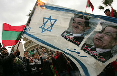 בצידון שרפו דגלי ישראל, ועליהם תמונתו של נשיא מצרים (צילום: AFP)