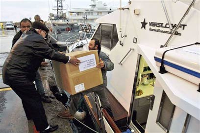 מניחים ציוד על ספינת הפעילים (צילום: AP)