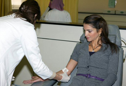 סיוע עולמי: המלכה ראניה תורמת דם לעזה בירדן (צילום: AFP)