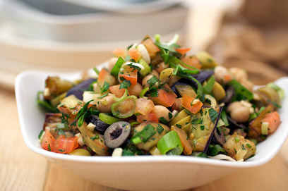 - מוסיפים בצל, פטרוזיליה,שום, חצילים וגרגרי חומוס ומערבבים.