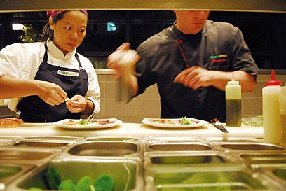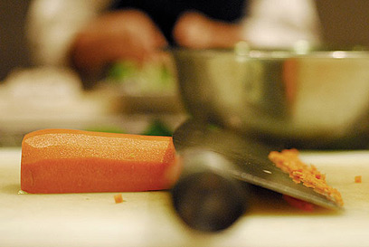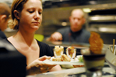 בשעה 10:00 עומדים כמה סירים על האש. מתבשלים: רוטב טמפורה, שני מרקי מיסו, ציר בקר עשיר, והקטשופ שעובר סיבוב שני של הסמכה. ניצן חותך פילה בקר לנתחים של בערך 200 גרם, ואז מתרגז על הסו־שף. למיטב הבנתי הבעיה היתה בערב הקודם, כשמנסורה - שעסוק כרגע בלהפוך קפה לקוויאר מוצק בטעם קפה - הוציא לאחת הסועדות מנה אחרת לגמרי מזאת שהזמינה. השיחה ביניהם מתלהטת ליד מקרר הבשר, ורז צועק, "אחי, די כבר. אני לא בגנון, ואני לא אהיה נחמד כל היום. היא לא קיבלה את מה שהיא רצתה. הזמינה פטרייה ולא קיבלה". אחרי שנייה הוא מחייך אלי מהפס הקר. "אל תיבהלי", הוא מרגיע אותי. "זה חלק מהעניין". ואכן כעבור רגע נרגעות הרוחות, והאווירה הטובה חוזרת עד שמנסורה שוב זורק הערה שאינה במקומה, וחוזר חלילה. ככה זה עובד שם.