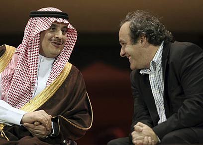 נשיא אופ"א מישל פלאטיני חולק רגע עם סולטן בין פאהד הסעודי (רויטרס)