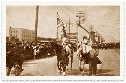 3. 19 ביולי 1919, בעת מצעד בוויניפג לכבוד הצהרת בלפור - לאה רוכבת בראש המצעד ומניפה דגל כחול-לבן
