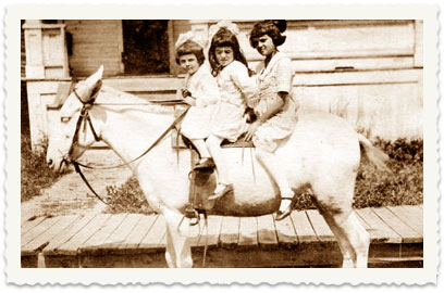 9. 1920, בוויניפג, שלוש הבנות הצעירות במשפחת קוקוי על חמור לבן. מימין: טובה, ציפורה, מרים