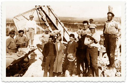14. 1924, ליד מגרסת אבן בשדות יגור, בעת בניית מפעל נשר. מימין (עומד על סלע) - מאיר, באמצע (אוחז בידו כובע) - שאול