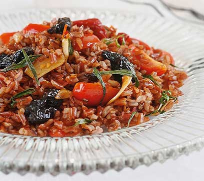 אורז אדום עם שרי תמר, עגבניות מיובשות, זיתי טאסוס וטרגון
