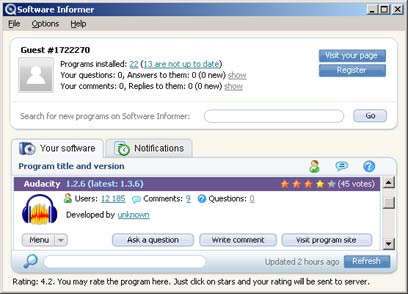 כך, למשל, זיהה ה-Informer כי אנחנו עדיין משתמשים ב-13 תוכנות לא מעודכנות מתוך 22 תוכנות מותקנות בסך הכל. הכלי זיהה את תוכנת הקלטות האודיו Audacity 1.2.6, והציע לשדרג אותה לגירסה 1.3.6. בהקלקה על התוכנה המיושנת אפשר לגשת לאתר היצרן כדי לעדכן אותה, להסיר או לבקש שלא לקבל מידע על גירסאות חדשות לגביה. אפשר להירשם לשירות עדכונים דרך האתר הרשמי של התוכנה, אבל לא חייבים לעשות זאת כדי להשתמש בה.