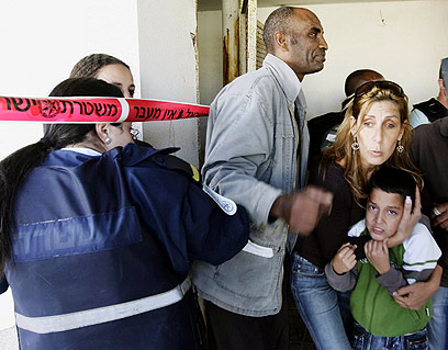בניין המגורים הפגוע באשקלון. התושבים התגודדו בסמוך (צילום: גיל יוחנן)