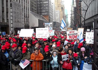חרף גל הקור הפוקד את ניו יורק, עשרת אלפים מפגינים הגיעו היום (א') למרכז מנהטן כדי להשתתף בעצרת הזדהות עם ישראל - מהגדולות ביותר שנראו עד כה למענה בארצות-הברית מאז החל המבצע הצבאי בעזה.