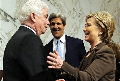 הילרי קלינטון לצד ג'ון קרי וכריסטופר דוד בסנאט, היום (צילום: AP)