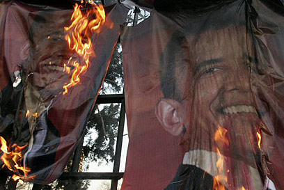 הצתת תמונתו של אובמה בטהרן, היום (צילום: רויטרס)