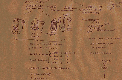 עכשיו, בעט האדום שלו, הוא מתחיל לצייר סיר, ומעמיד אותו על האש: "הזיקוק הבסיסי ביותר", הוא מסביר, "היה בסיר, על אש ישירה. הזגים היו נשרפים, והיתה מתקבלת ארומה מעושנת ושרופה, לא רצויה, בגראפה. אחר כך עברו לבאן-מרי, ערבבו את הזגים המותססים במעט מים, וזיקקו. עדיין היה ריח שרוף, אבל אם ערבבת כל הזמן - יצא משקה סביר בהחלט".