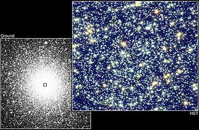 משמאל, צביר הכוכבים "טוקאן 47". מימין, הגדלה של ליבת הצביר, כשהמתאבקים הכחולים מוקפים בעיגול (צילום: טלסקופ האבל, נאס"א)