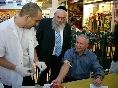 השר אבי דיכטר תורם דם למאגר. מאחוריו, יו"ר עזר מציון הרב חנניה צ'ולק (צילום: מתי גיל)