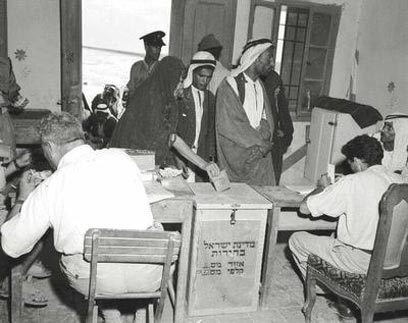 בדואים מצביעים בנגב ב-1951 (צילום: דוד אלדן, לע"מ)