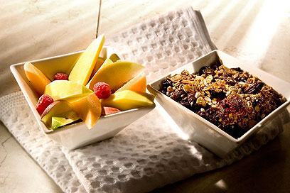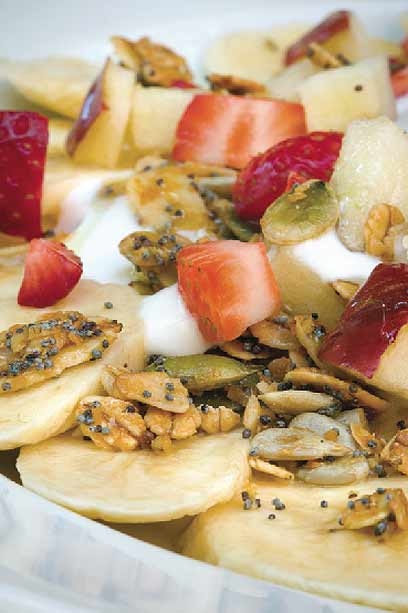 להגשה:יוגורט, דבש, פירות טריים, חתוכים – אם רוצים