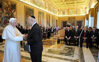הרב שנייר והאפיפיור בנדיקטוס, היום בוותיקן (צילום: AFP)
