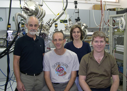 משמאל לימין: ד"ר איתן גרוסמן, רונן ורקר, ד"ר אירינה גוזמן, פרופ' נעם אליעז, על רקע המעבדה לדימוי סביבת החלל במרכז למחקר גרעיני שורק. (צילום: באדיבות פרופ' נעם אליעז)