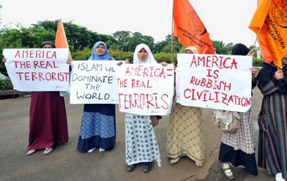 נשים מוסלמיות הפגינו בג'קרטה נגד ביקור קלינטון (צילום: AFP)
