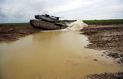 טנק בבוץ העזתי, אתמול באזור כיסופים (צילום: רויטרס)
