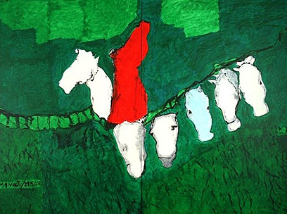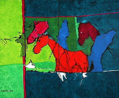 סוסיו של גבעתי משתוללים על בדי הציור כמו מפלצות מיתולוגיות. האדומים, הכחולים והירוקים מייצרים אפקט מטלטל הניתן לקריאה כניסיון לתאר מצב נפשי. בסופו של דבר מתפרקים גושי הצבע הגדולים לכלל דימוי גולמי מופשט. בתוך הצבע המתפשט והצורות הבלתי מזוהות, מוזמן כל אחד מהצופים לשקוע בעומק הבד ולמצוא בו את הסוס האישי שלו.