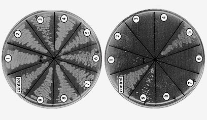 חיידקים נורמליים (משמאל) גדלים ומתרבים על צלחת פטרי, בעוד שחיידקים אליהם הוחדר גן קטלני (מימין), שזוהה באמצעות השיטה שפיתח ד"ר שורק, אינם גדלים (צילום: באדיבות מכון ויצמן)